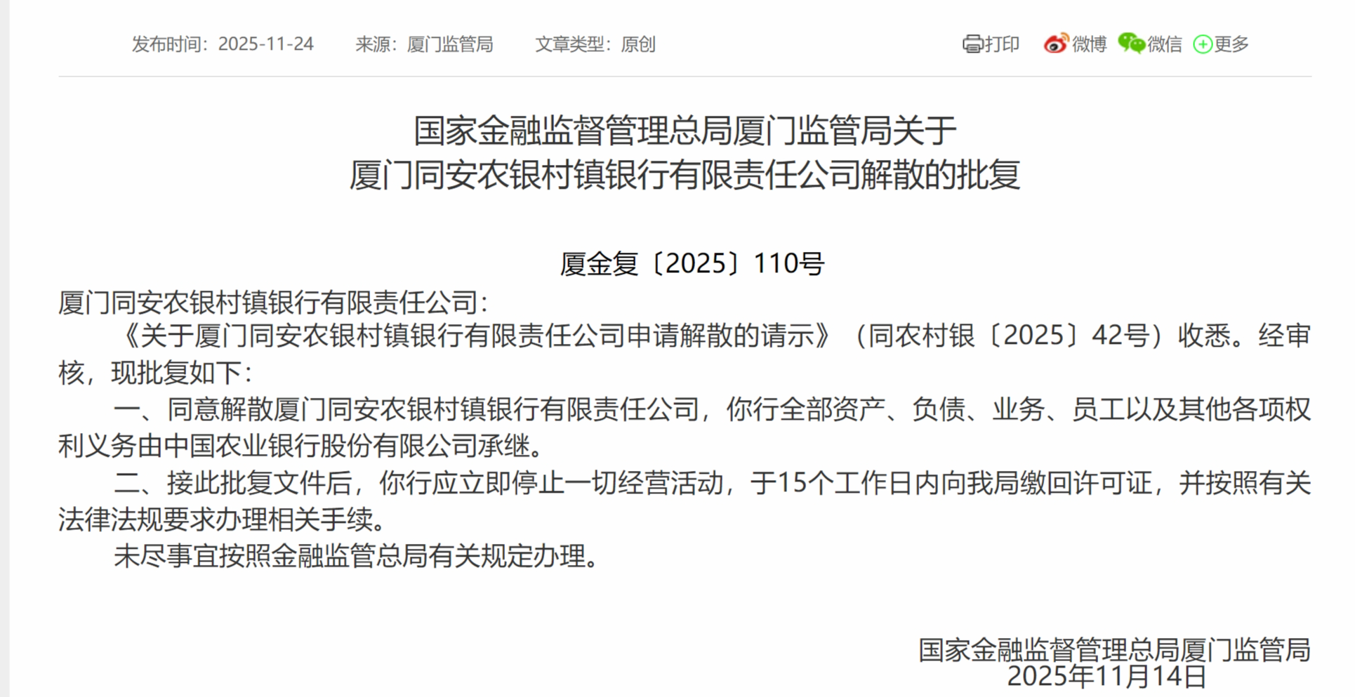 11月24日,国家金融监督管理总局厦门监管局发布《关于厦门同安农银村镇银行有限责任公司解散的批复》,同意解散厦门同安农银村镇银行有限责任公司,该行全部资产、负债、业务、员工以及其他各项权利义务由中国农业银行股份有限公司承继。