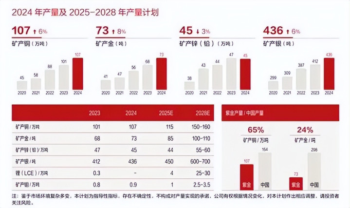 截至2024年底,公司按控股企业100%口径及联营合营企业权益口径计算,报告期末保有探明、控制及推断的总资源量为铜11037万吨、金3973吨、锌(铅)1298万吨、银31836吨,锂(LCE)1788万吨;其中,保有证实储量和可信储量:铜5043万吨、金1487吨、锌(铅)804万吨、银3253吨、锂(LCE)860万吨,铜、金、锌储量分别位居全球第二、第五和第三。