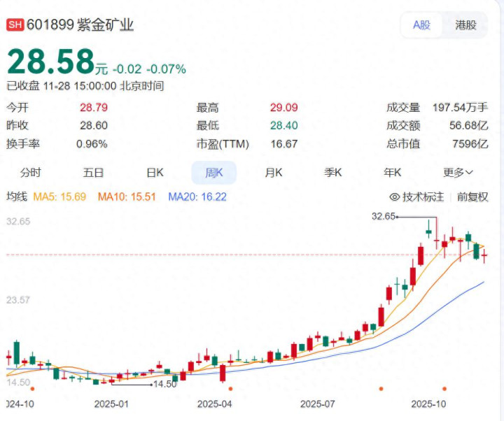 截至28日收盘,紫金矿业股价报收28.58元,年初至今已涨超95%,总市值达7596亿元。